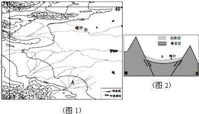 ??? 2010年5月,中央新疆工作会议上中央正式批准喀什设立经济特区。喀什是中国的西大门,它地处亚欧大陆中心,边境线长达982公里,与五国接壤,有6个国家一类口岸对外开放,具有“五口通八国,一路连欧亚”的独特区位优势。图1和图2为该地所在区域图和地质剖面图。 材料二: