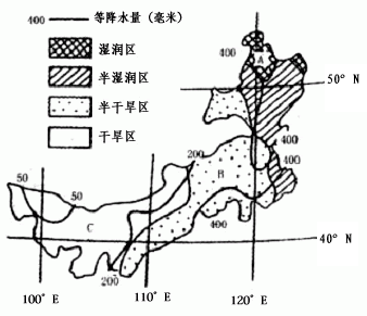 4、综合题 读“我国某地区的干湿状况图”,回答: