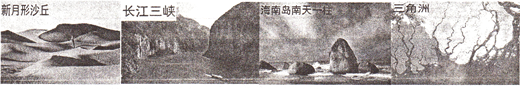 【小题2】本题主要考查塑造地表形态的外力作用,其中不易区分可能是海南岛南天一柱。解决本题需掌握不同外力作用所形成的各种地表形态。e环节是地表径流,多表现为流水作用形成的地貌。选项A是新月型沙丘,属风力堆积地貌;长江三峡是流水侵蚀地貌;海南岛南天一柱是海蚀地貌,选项D河口三角洲,是流水堆积地貌。