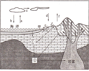 2、单选题 下图为“水循环和岩石圈物质循环示意图”,其中字母a至f为水循环环节,①②③代表三大类岩石。读图回答下列问题。