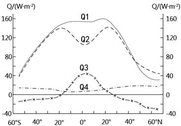 图中表示海面热量总收支差额、辐射收支差额、蒸发耗热量、海—气传导差额的曲线,依次是