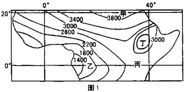 点评:本题组考查非洲自然地理特征及其影响,同时考查了影响年日照时数的因素。图中显示年日照时数由乙到甲地逐渐增大,主要是由于气候不同造成的,甲乙分 别是热带沙漠和热带雨林气候,而气候的差异又是由大气环流不同造成的。乙丙同一纬度,但由于丙地地势高而形成热带草原气候,降水少而年日照时数多。甲地处于热带沙漠气候区,因此水源是其农业发展的限制性因素。
