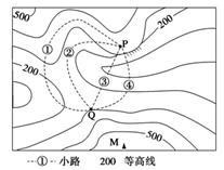1.从图中可以看出,P、Q两点之间的四条小路中,②线穿越的等高线最少,地形起伏最小。