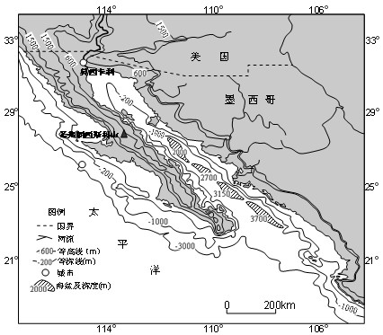 (1)描述图中半岛东部海湾的等深线特征,并分析成因。