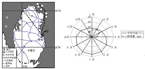 3、综合题 根据图文材料(左图为卡塔尔区域示意图,右图为该国首都多哈气候统计图),完成下列问题。(24分)