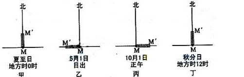 小题3:若在M地垂直立竿,则图中MM′所示日照竿影朝向正确的是(?)