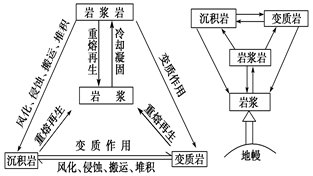 点评:本题难度中等,解答本题的关键是熟练掌握岩石圈物质循环过程,明确图示箭头代表的各种作用力。