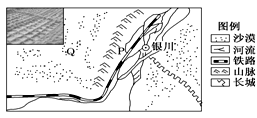 单选题 该图是我国西部某地区略图,图中左上方所示为当地铁路沿线的草方格沙障。回答问题。1.P地与Q地相比,P地