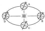 (2)经判断D为夏至,C为秋分,B为冬至,A为春分,北半球白昼达最大时,为北半球的夏至,应为D处;全球没有极昼和极夜现象时为春分或秋分,在A、C处。