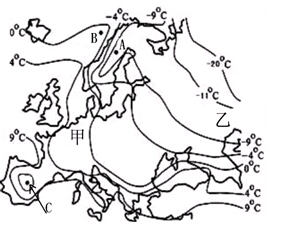 【小题1】A、B所在地区等温线发生弯曲,主要原因分别是( )