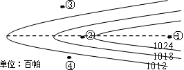 小题1:本题考查地理图表的判读能力。根据图示图中为高压脊位置,①地气压高于1024,为气压最高处。所以本题选择A选项。