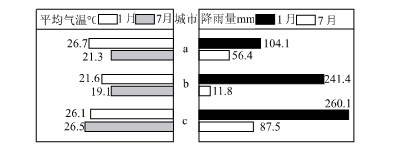 (1)结合所提供的信息,比较a、b、c三城市的1月、7月平均气温与降雨量,写出温差变化最小和降雨量变化最大的城市,并分析其原因。