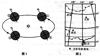 1.当“神舟八号”飞船发射升空时,地球在公转轨道的位置最接近图1中的2.当“神舟八号”飞船与“天宫一号”目标飞行器第一次对接成功时3.图2所示的我国四个卫星发射基地中,使用同样燃料,火箭发射速度最快的基地是