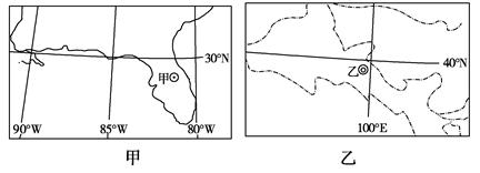 单选题 读世界著名的航天城美国的肯尼迪航天中心(甲)与我国的酒泉卫星发射中心(乙) 示意图,回答下列问题
