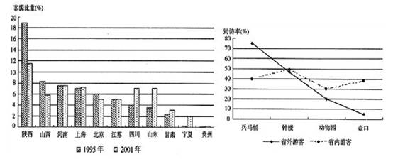 单选题 下面左图是“西安市国内游客构成省际变化图”,右图是“游客对西安市及周边旅游景点到访率统计图”,读图回答问题。