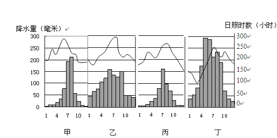 1.本题考查中国自然地理中我国东部降水量的南北变化规律,需注意掌握我国东部地区降水的 91EXAM.org变化规律和典型城市的降水特征。我国东部地区地处季风区,降水量自北向南由少到多。据图中降水柱状图可以推知,甲地7、8月降水较多,与北京市的降水柱状图一致,乙图与武汉的降水柱状图类似,丙图与哈尔滨的降水柱状图相近,丁图与广州的降水柱状图类似。