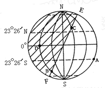 (2)此时A点的地方时为 ____点,该日B地的昼长为_____小时。地球上有极夜现象的纬度范围是_____;此时新的一天的经度范围是______。(4分)