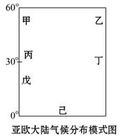 【小题2】季风气候只分布在大陆东岸,地中海气候只分布在大陆西岸;地中海气候地处亚热带,分布在南北纬30°-40°大陆西岸,故丙为地中海气候,乙为温带季风气候,甲为温带海洋性气候,丁为亚热带季风气候,结合选项C正确。