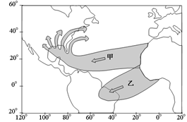 小题2:当沙尘扩散如甲所示时,表明来自非洲撒哈拉沙漠的沙尘在东北信风的吹拂下吹到了北美洲,因此此时应为北半球的夏季。