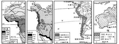 小题1:读图可知纵坐标为降水量,横坐标为(0°----40°)纬度,受大气环流和下垫面的影响,非洲、北美、南美、澳大利亚的大陆西岸降水量随纬度的变化如图所示: