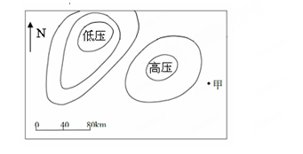 【小题1】由材料可知,该气压系统以每天120千米的速度自西向东移动,24小时后移动120千米,高压中心到达到达甲地的东北侧,根据风向画法得出风向。