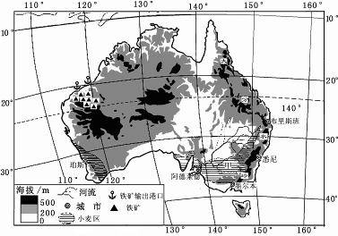 (2)澳大利亚的人口和城市主要分布在东南沿海地区,其最有利的自然条件是____澳大利亚最大的矿产品出口国是_______。(4分)