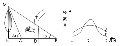 【小题1】图中NA、NB分别是北半球某地树木MN一年中正午日影最短和最长的影子,可判断3α和α分别是夏至日和冬至日的正午太阳高度:3α=90°-(当地纬度-23°26′),α=90°-(当地纬度+23°26′);由此可算出当地纬度为43°08′N;该地在北回归线以北,物体正午时影子一定指向正北方;已知AB与河流PQ正好垂直,则PQ指示东西方向,P在西、Q在东;由河流径流量图示可看出,P点流量变化大,而Q点流量变化小,PQ两点间的湖泊对河流干流流量有调节作用,使得湖泊以下流量变化减小,由此可判断河流由P流向Q,即河流自西向东流。