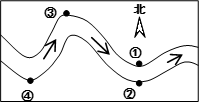 图示中河流凹岸侵蚀,凸岸堆积,图中②③④为凹岸,①为凸岸,排除A项;位于北半球,受地转偏向力影响右偏,排除C项,因④位于②河段之上,侵蚀比②严重,所以选D正确。