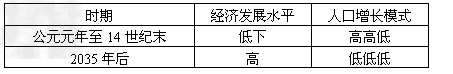 (3)据有关专家预测,至2035年,我国人口将步入零增长。而从公元元年至14世纪末,我国人口几乎一直维持在6000万至7000万左右。试比较我国这两个缓慢或零增长时期的人口发展模式,填写下表: