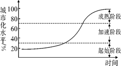 第(3)题,阅读表格中前两项数据可以看出城镇化水平南北方向上的差异。城镇化进程阶段的判断要把表中数据落实在“城市化发展曲线图”上进行对照。