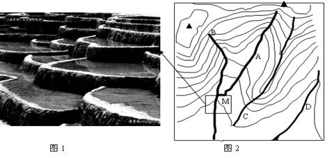 4、单选题 图2是我国某石灰岩分布广泛地区的等高线图,图2中A河流被称为“白水河”,人们发现这条河流的底部呈乳白色;而B河流被称为“黑水河”,人们发现这条河流的底部沉积了大量黑色的淤泥。图1是图2中M处天然形成的碳酸钙沉积作用形成的水池,并且还在不断地增多和长大,科学术语被称为“钙化池”,钙化池光滑平整,水平如镜,清澈见底。据此回答下列小题。