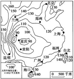 5、综合题  (8分)读我国太阳辐射总量分布局部示意图,回答下列问题。