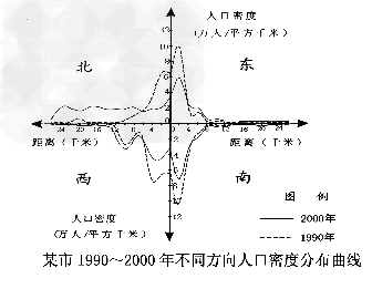4、单选题 下图是“某市1990 ~2000 年不同方向人口密度分布曲线”图,回答1-2题。