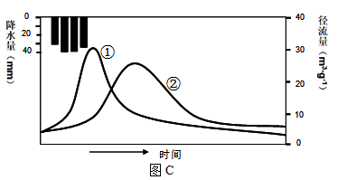 材料三:图C为不同时期该地河流在等量降水过程后形成的洪水过程线示意图。
