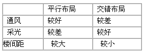 (3)该大型居住区楼房有平行布局、交错布局等,试对两种布局的住宅通风、采光、楼问距进行比较。
