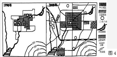4、单选题 图4是“我国某城市1990年和2008年的功能区分布简图”,读图完成10-11题。