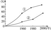 3、综合题 读“世界发达国家与发展中国家城市人口占总人口比重变化曲线图”,完成下列问题。