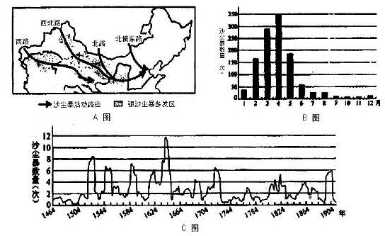 (2)由B图可知,沙尘暴主要集中在冬春季节或春季。主要原因是此季节降水少,气候干燥,多大风天气。