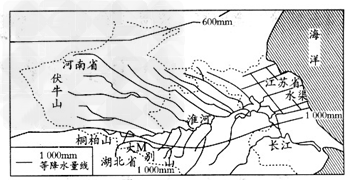 下图为淮河流域水系图。?(1)据图说明淮河流域降水量的分布特点。分析M地形成降水峰值中心的原因。