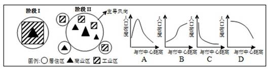 5、单选题 图为“某城市发展阶段图”,读图回答题。1.图中能正确反映Ⅱ阶段都市人口密度与距离市中心的远近两者之间关系是2.Ⅱ阶段城市不会发生的现象有