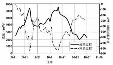 根据图例,图示右侧轴为负值,说明图示时间段内,该河段一直冲大于淤,A错。流量越大,侵蚀作用越明显,B对。流量大小与沉积作用强弱成负相关,C错。流量与含沙量没有相关性,D错。