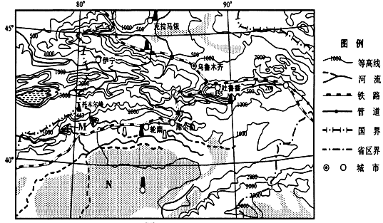 (1)据图判断伊宁与吐鲁番两地年降水量的差异,并分析原因。(2分)