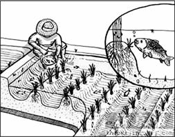 材料三?浙江省青田县“稻田养鱼模式图”。