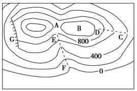 1.此题考查地形的判断。A点在两座山峰之间,等高线稀疏,地形平坦,为鞍部;DC等高线向低海拔凸,为山脊(分水岭);EF等高线向高海拔凸,为山谷(集水线);G处等高线重合,为陡崖;B地等高线四周向中间递增,且等高线为闭合,为山峰。故选A。