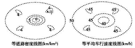 3、单选题 道路密度指一定区域内,道路网的总里程与该区域面积的比值。平均车行速度是指某地区各种汽车的平均行车速度。下图是某特大城市道路密度和平均车行速度等值线图,读图,回答题。?1.甲处不可能出现的地理事物是2.提高大城市中心区行车速度的有效方法是