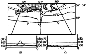 (2)甲图,因为P点至Q点之间的局部等温线向低纬凸出,表示该地气温低,地势高,为山地。