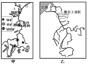 小题1:图中没有比例尺,不能判断两条河流的通航里程,A错。甲河流域植被是亚热带常绿阔叶林,乙河流域植被是温带落叶阔叶林,B错。图中长株潭经济圈目前正处于工业化发展阶段,鲁尔区是发达地区,是工业化后期阶段,C错。集约化农业是投入比较多的劳动、资金、技术的农业,图中A地是水稻种植业,投入劳动多,B地投入的资金、技术较多的农业地域类型,所以均为集约化农业,D对。