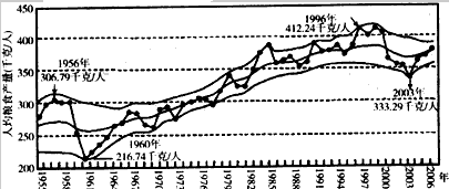4、单选题 ? 下图表示我国人均粮食产量变化情况。图中人均粮食产量围绕着趋势线一定范围内波动,从中间的趋势线到边沿的宽度,即为平均的波之比,表示粮食产量的稳定性高低。波幅越大,粮食产量越不稳定。阅读图文资料完成1—2题。
