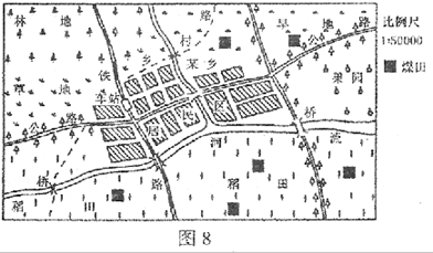 2、综合题 图8为“我国华北地区某乡驻地及周边部分辖区示意图”,经勘探发现图示区域有