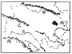 (1)青海馆外墙的色调由明快的绿、白两种颜色构成,绿色代表着江河源头的生命气息和净土特色,白色象征着高耸的昆仑雪峰。“青海省地理简图”上甲、乙、丙三条山脉中表示“昆仓山脉”的是________________;图中A、B、C三大江河分别是指__________、__________和__________。